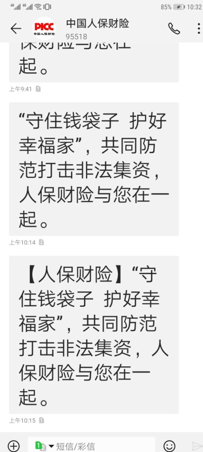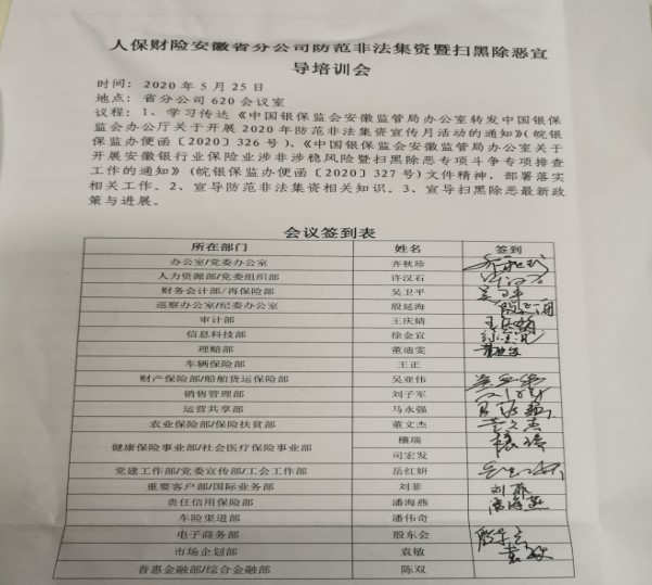5月26日上午,省公司法律合规部/风险管理部举办防范处置非法集资风险工作专题宣导会,组织省公司各部门业务骨干认真学习2020年防范非法集资宣传月活动文件并宣导防非非法集资相关知识;在省公司内网设立“防范非法集资宣传月”宣传专栏,刊登防范非法集典型案例、宣传教育标语、打击和处置非法集资政策法规知识问答等宣传知识;通过95518给全系统7744名员工短信发送“守住钱袋子·护好幸福家”,共同防范打击非法集资--人保财险与您在一起。
